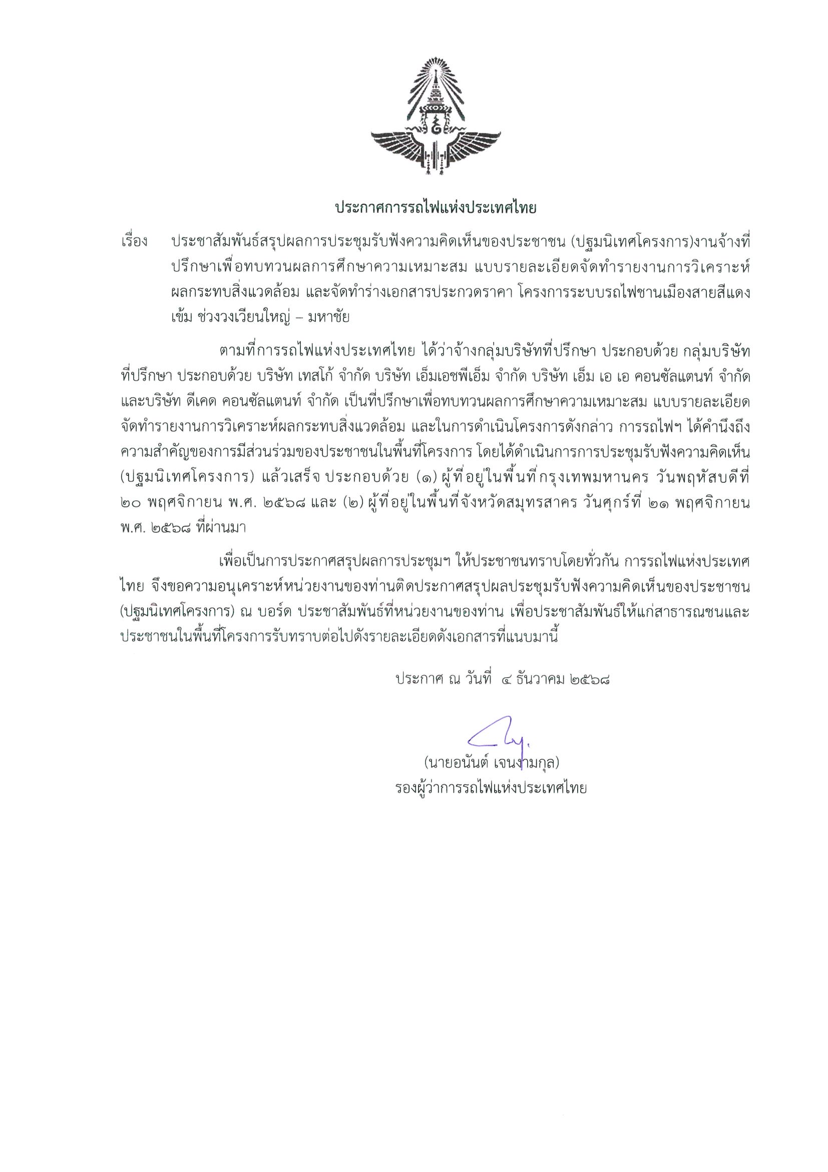 การรถไฟแห่งประเทศไทย ได้ดำเนินการทบทวนผลการศึกษาความเหมาะสม แบบรายละเอียด จัดทำรายงานการวิเคราะห์ผลกระทบสิ่งแวดล้อม และจัดทำร่างเอกสารประกวดราคา โครงการระบบรถไฟชานเมืองสายสีแดงเข้ม ช่วงวงเวียนใหญ่–มหาชัย ซึ่งเป็นส่วนหนึ่งในโครงการระบบรถไฟชานเมือง (สายสีแดง) เพื่อให้โครงข่ายระบบขนส่งมวลชนระบบราง เป็นไปตามแผนแม่บทการพัฒนาระบบขนส่งมวลชนระบบรางในกรุงเทพมหานครและปริมณฑล โดย การรถไฟแห่งประเทศไทยและกลุ่มบริษัทที่ปรึกษาได้ดำเนินการจัดการประชุมปฐมนิเทศโครงการแล้วเสร็จ เมื่อวันที่ 20-21 พฤศจิกายน พ.ศ. 2568 เพื่อให้ผู้ที่มีส่วนได้ส่วนเสียกับการดำเนินงานโครงการ ทั้งหน่วยงานราชการ รัฐวิสาหกิจ หน่วยงานในกำกับของรัฐ องค์กรภาคเอกชน องค์กรปกครองส่วนท้องถิ่น ผู้นำชุมชน และประชาชนในพื้นที่ ได้มีส่วนร่วมในการรับรู้และให้ความเห็นต่อโครงการตั้งแต่ในระยะเริ่มต้นของการดำเนินโครงการ โดยเป็นส่วนหนึ่งของการดำเนินงานตามแนวทางการมีส่วนร่วมของประชาชนในกระบวนการจัดทำรายงานการประเมินผลกระทบสิ่งแวดล้อมตามประกาศสำนักงานนโยบายและแผนทรัพยากรธรรมชาติและสิ่งแวดล้อม (สผ.) กรกฎาคม 2566 และระเบียบสำนักนายกรัฐมนตรีว่าด้วยการรับฟังความคิดเห็นของประชาชน พ.ศ. 2548 โดยมีผู้เข้าร่วมประชุม รวม 362 คน